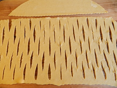 3) Stendete la pasta sfoglia e poi con la punta di un coltello praticate serie alterne di tagli alti 6 cm e distanti 2 cm, procedendo con la serie successiva a circa metà altezza della precedente (come nella fotografia).