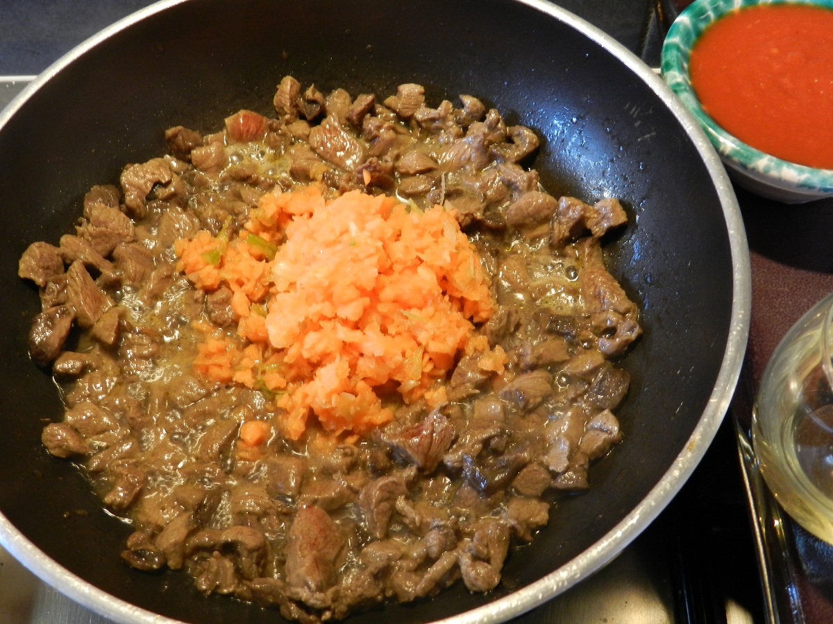Aggiungete la carne macinata e continuate la cottura a fuoco lento per un paio d’ore, aggiungendo quando necessario un po’ di brodo.