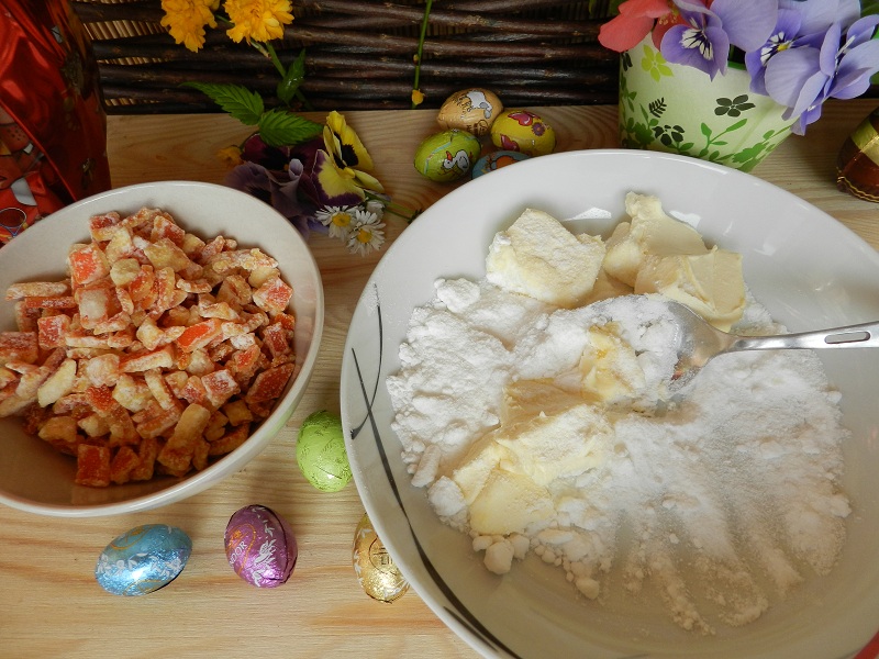 Sgonfiate la pasta lievitata, incorporate i canditi, le mandorle polverizzate ed 80 gr di burro già amalgamato con lo zucchero a velo, procedete con la 3° lievitazione.