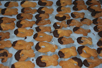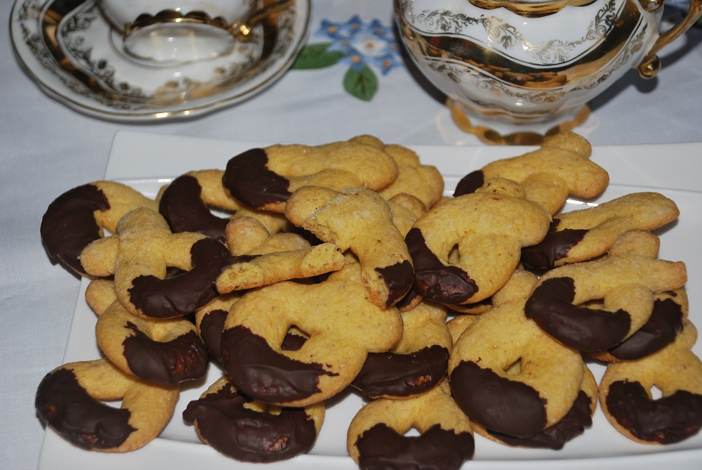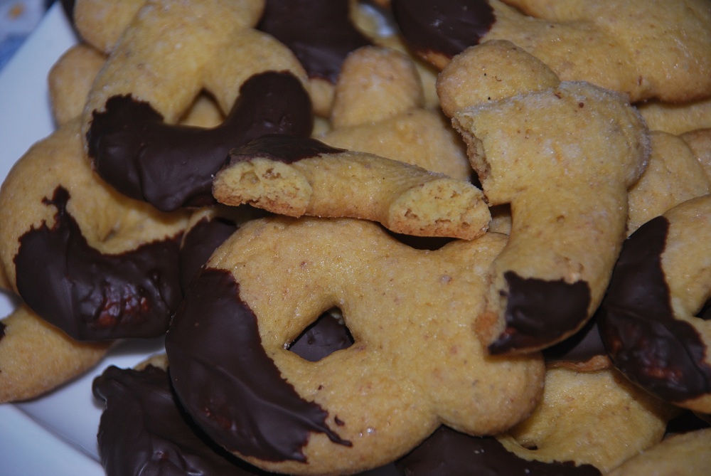 Lasciate raffreddare, poi intingete l’estremità arrotondata dei biscotti nel cioccolato fondente che avrete fatto sciogliere a fuoco basso per un paio di minuti, poi mettete in luogo fresco per far solidificare il cioccolato.