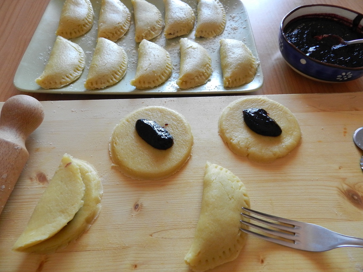 Al centro di ogni cerchio di pasta sfoglia mettete un po’ di marmellata di more, rigirate su se stessa la pasta e chiudete premendo sul bordo coi rebbi di una forchetta.