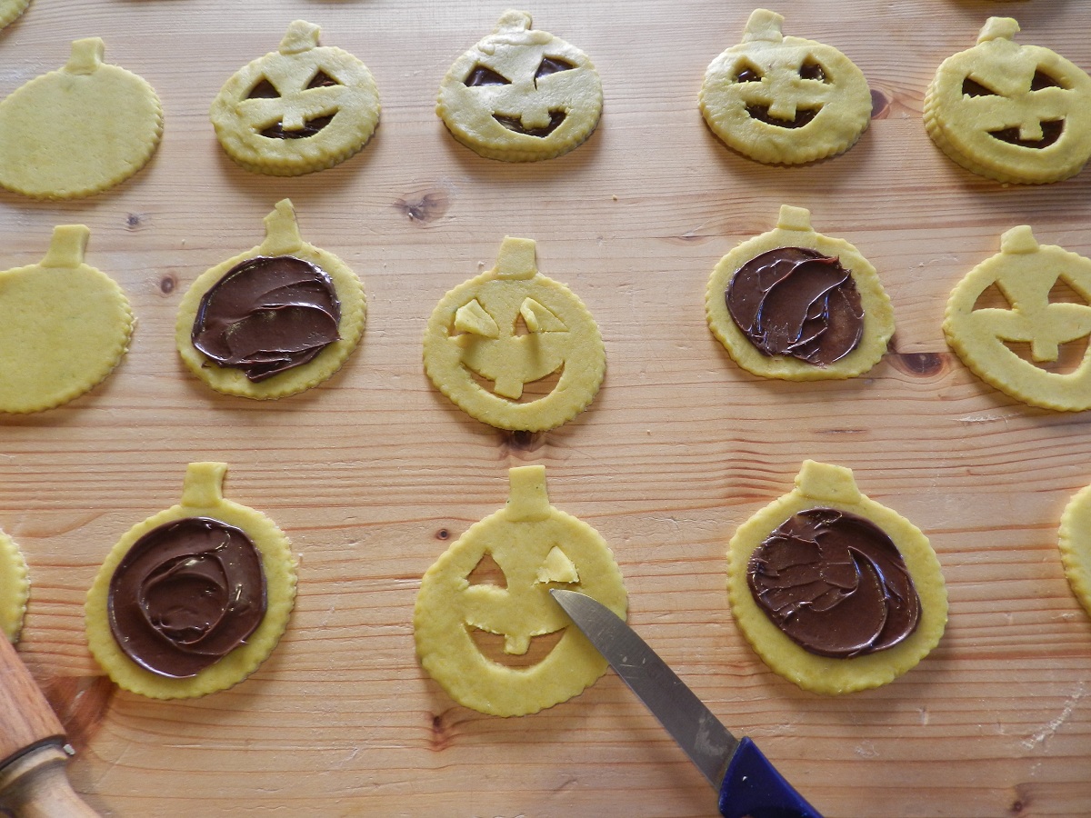 Attaccate ad ogni cerchio un piccolo rettangolo di pasta, per formare il “manico della zucca”. Su uno spalmate nel mezzo un po’ di Nutella e inumidite  il bordo con l’albume, l’altro lo intagliate a piacimento e lo sovrapponete  al primo. Proseguite così sino ad esaurimento degli ingredienti.