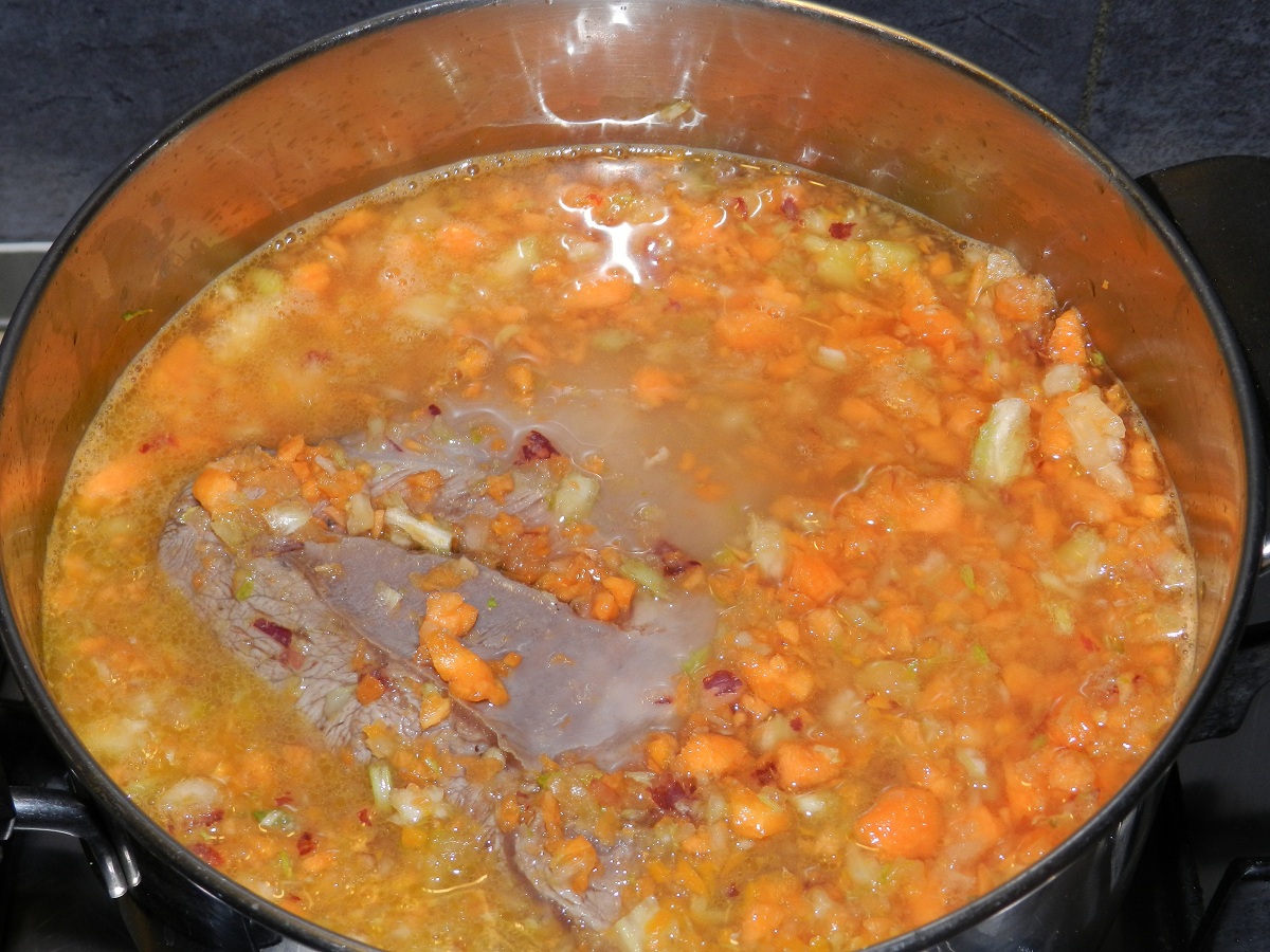 Unite le verdure tritate e il brodo, abbassate la fiamma, coprite con il coperchio e lasciate cuocere per 2-3 ore girando la carne ogni tanto