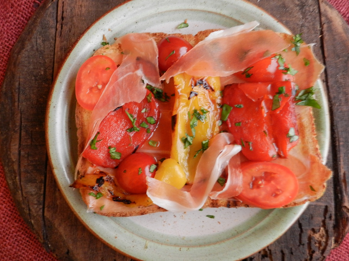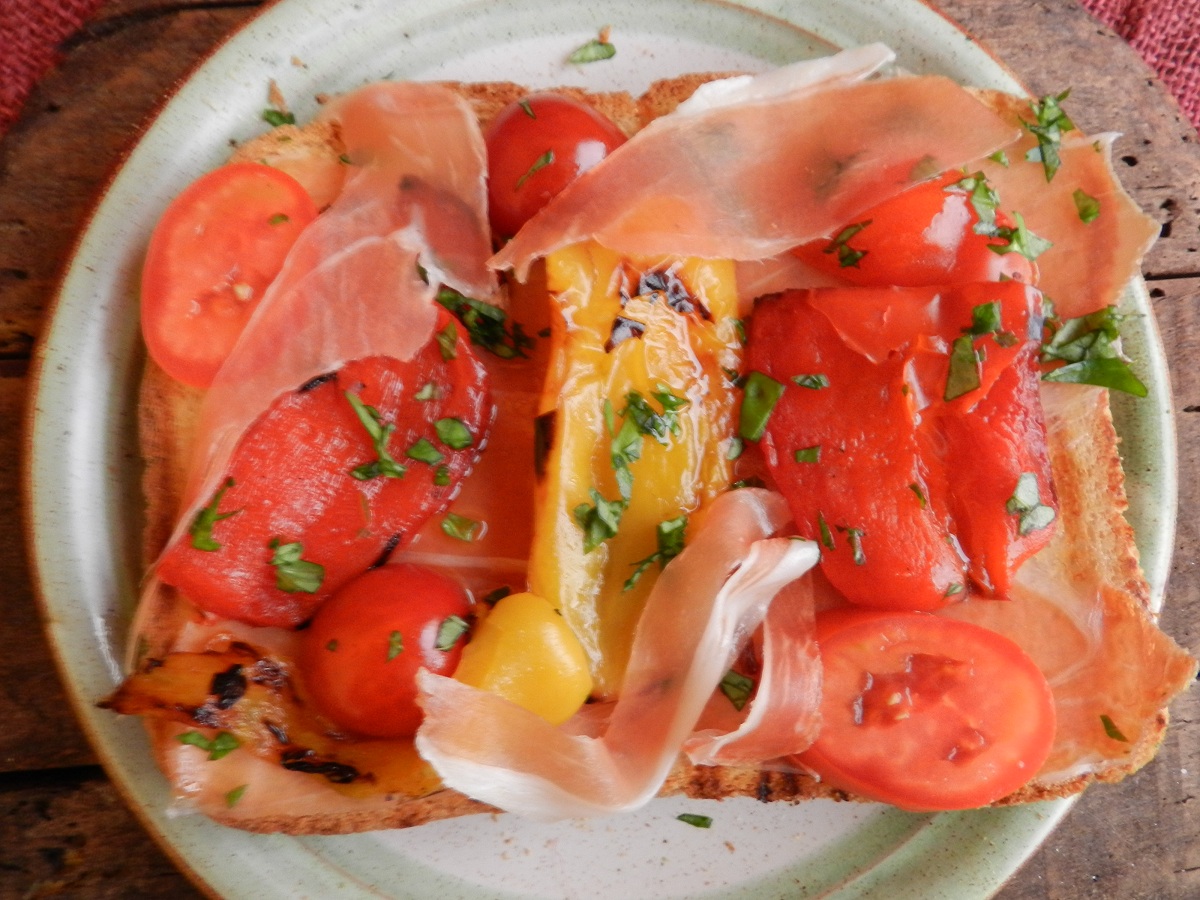 Fate abbrustolire i peperoni ed il pane sulla griglia da ambo le parti. Tagliate a metà i pomodorini, tritate il basilico e togliete le parti bruciacchiate ai peperoni. Strofinate il pane con l’aglio e ricoprite con prosciutto crudo, peperoni, pomodori, una spolverata di basilico, sale ed infine irrorate con un po’ di olio.