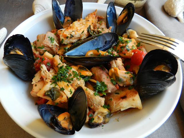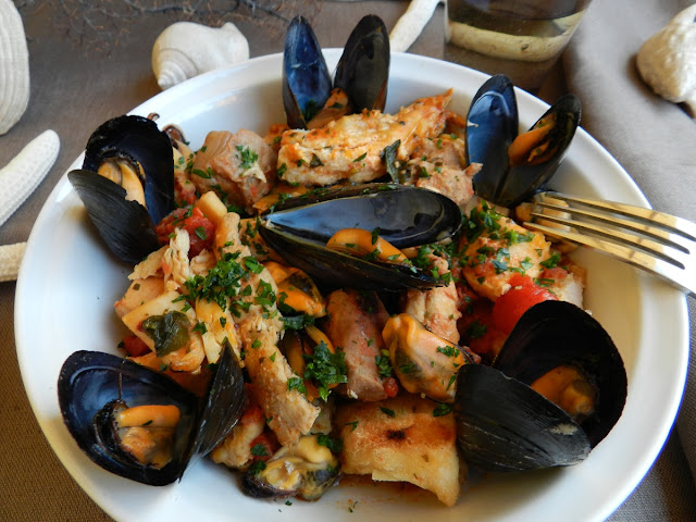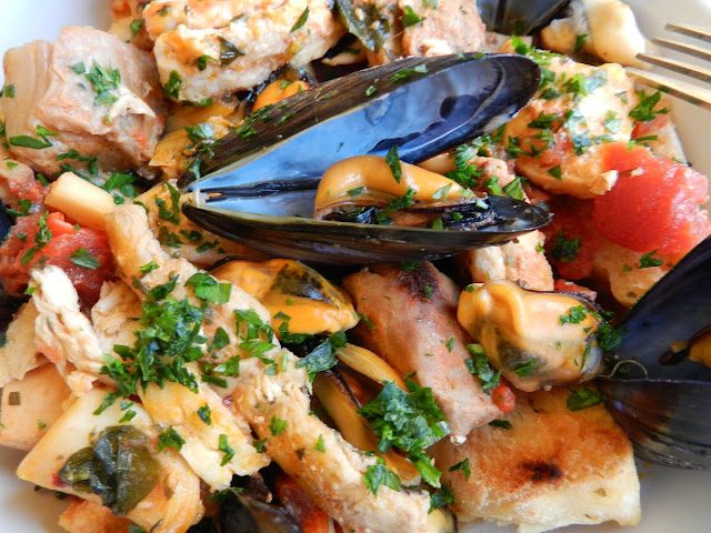Zuppa di pesce gustosa, un po’ piccante, aromatizzata con aglio e prezzemolo fresco. Il pane abbrustolito ed inzuppato sul fondo del piatto, accompagna gradevolmente il mix di pesce e aggiunge un’ulteriore consistenza a questo piatto dall’intenso sapore di mare.