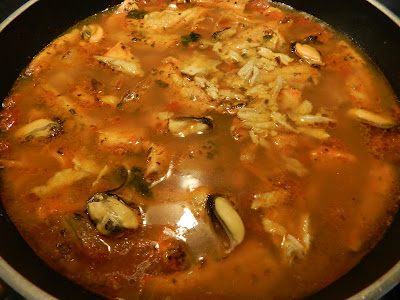 Quando il vino nella padella è evaporato e l’intingolo si è ristretto, unite le cozze sgusciate, versate poco alla volta il brodo preparato e continuate la cottura per circa un’ora.