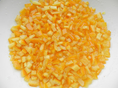 Pulite la scorza delle arance, tagliatela a cubetti, poi mettetela in una ciotola piena di acqua. Lasciate la scorza immersa per una giornata, cambiando l’acqua ogni tanto. Poi scolate e versate i cubetti di scorza in una padella con lo zucchero.