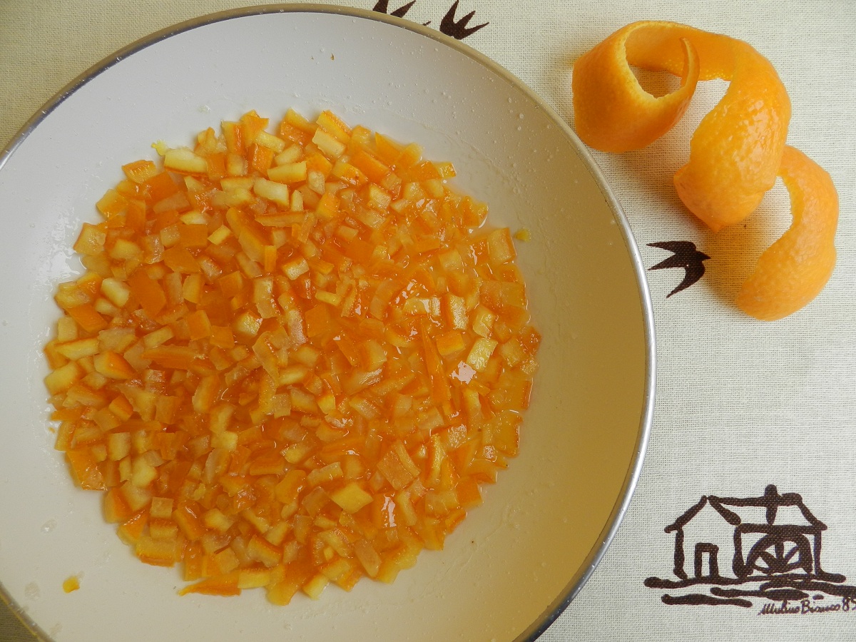 Pulite la scorza delle arance, tagliatela a cubetti, poi mettetela in una ciotola piena di acqua. Lasciate la scorza immersa per una giornata, cambiando l’acqua ogni tanto. Poi scolate e versate i cubetti di scorza in una padella con lo zucchero.