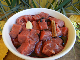 Tagliate a pezzi la carne e mettetela in una zuppiera, aggiungete gli aromi e le spezie, coprite con il vino e lasciate marinare in luogo fresco per 4-5 ore
