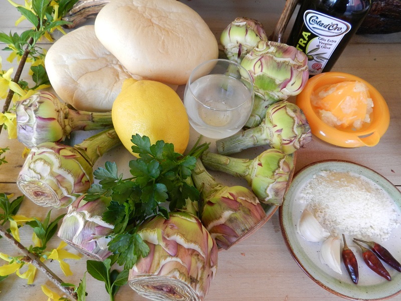 Noi li abbiamo serviti con ciuffetti di crema preparata frullando i gambi dei carciofi lessati per 15 minuti, 80 gr di tonno sott’olio, 100 gr di ricotta, 16 mandorle salate e tostate, sale e paprika, sino a ottenere un composto cremoso.