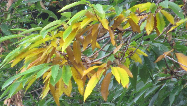 Castagno in autunno con tanti frutti pronti ad aprirsi e lasciare cadere a terre le castagne.