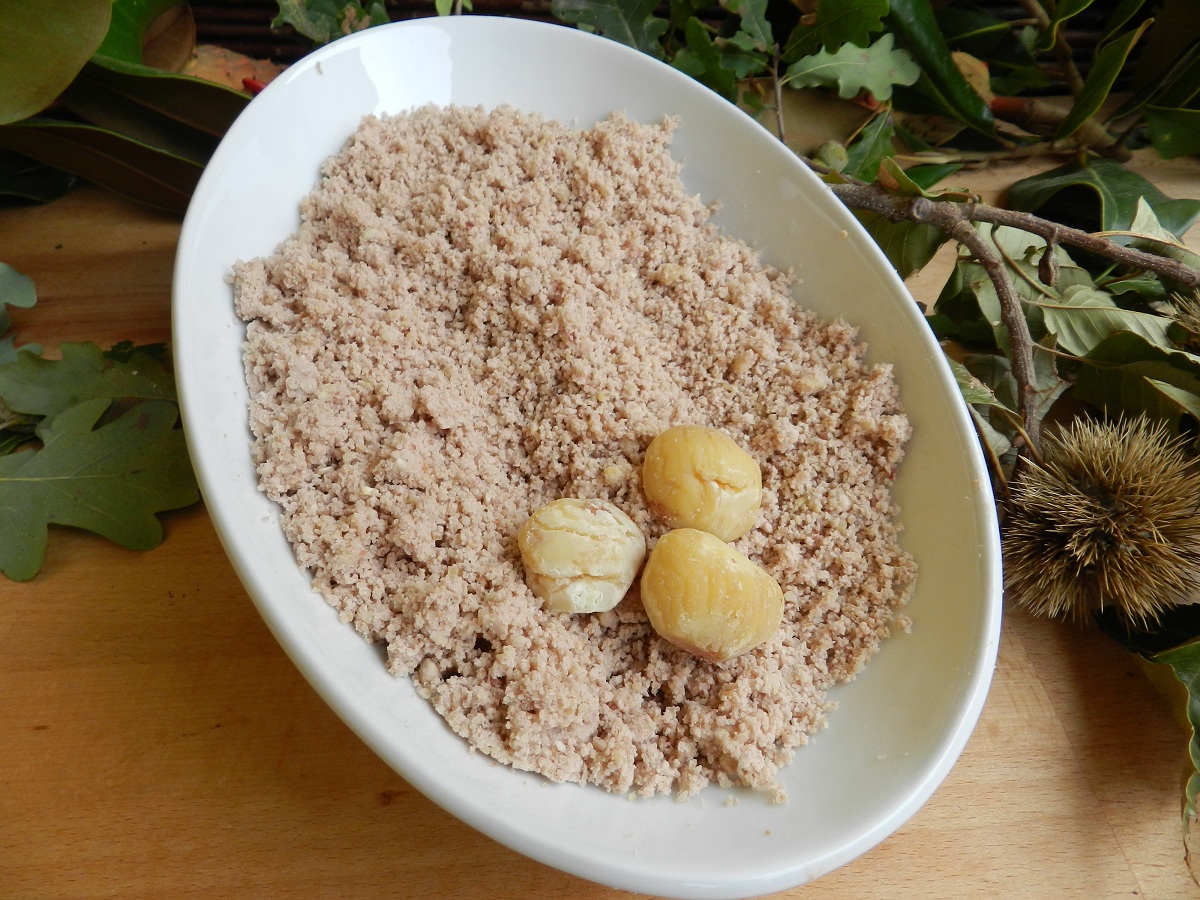 Eliminate la buccia e schiacciate le castagne con lo schiacciapatate, poi passatele al setaccio.