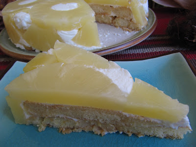 Ricoprite con la pellicola trasparente una teglia e sistemate le fette di ananas sul fondo e sul bordo, spalmate sopra un sottile strato di panna