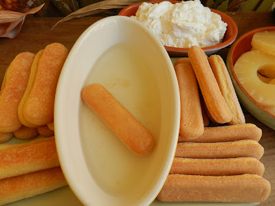 Montate la panna con lo zucchero ed intingete i savoiardi nello sciroppo d’ananas