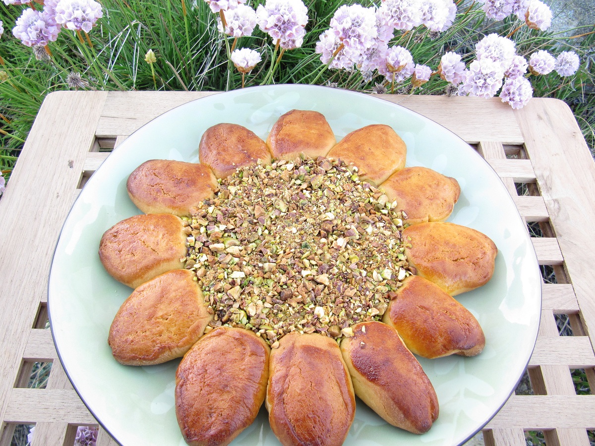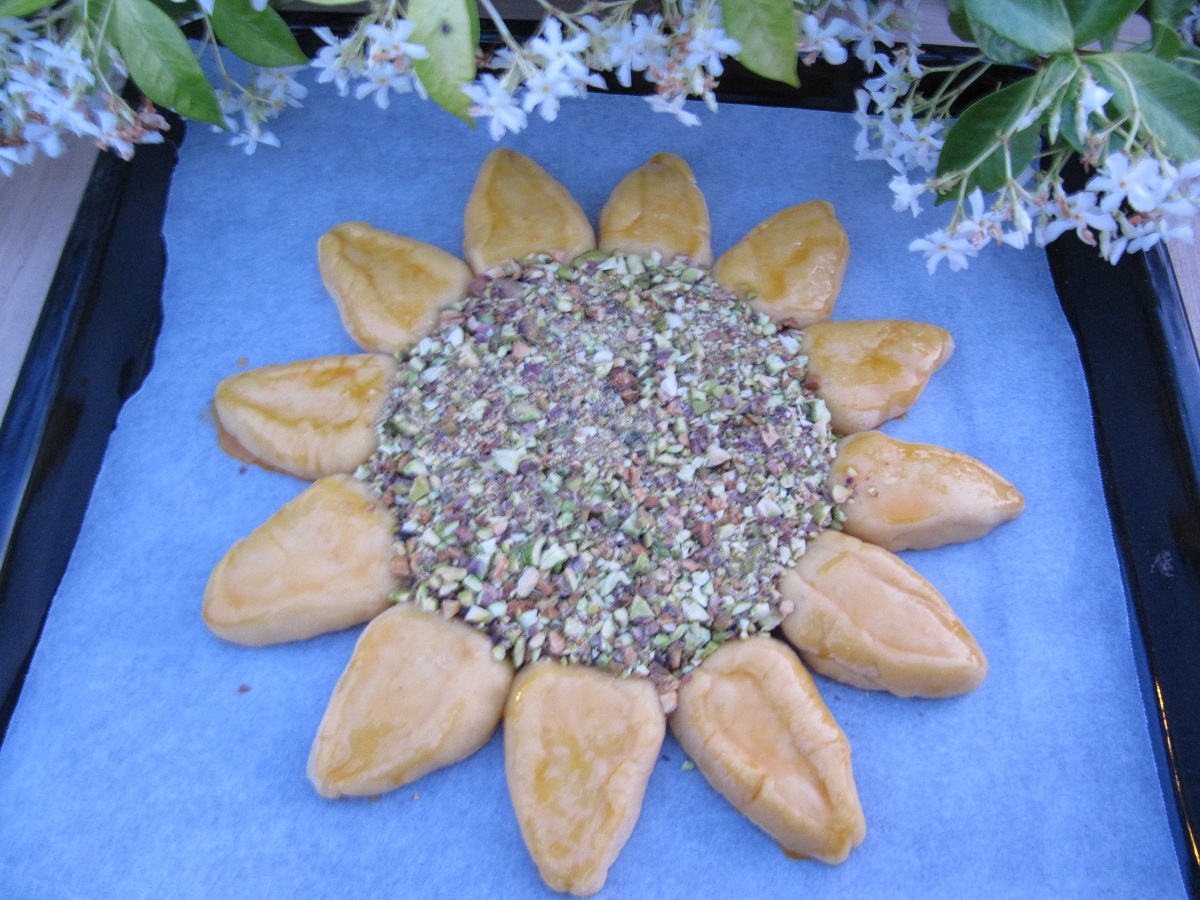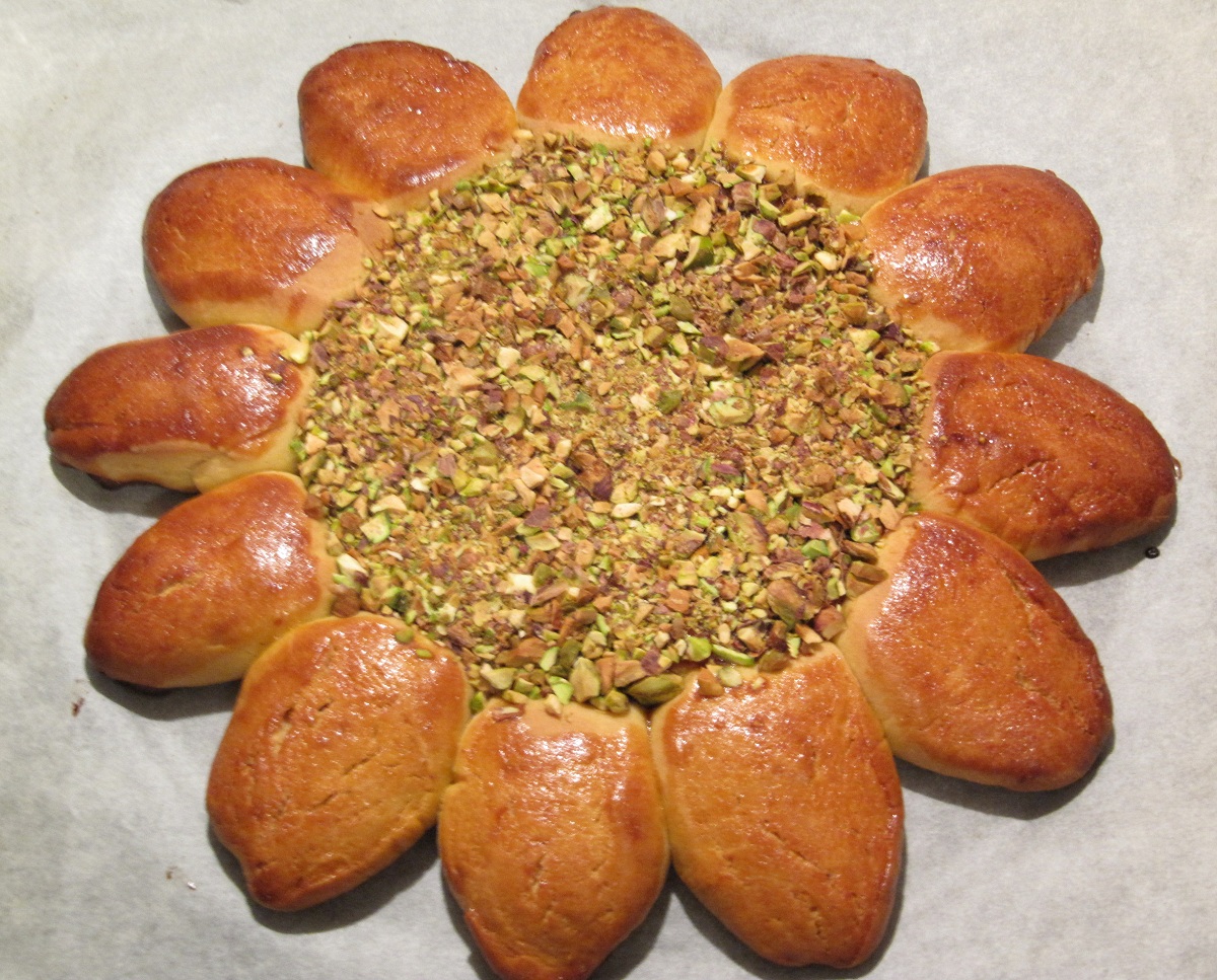 Quando l’impasto avrà raddoppiato il suo volume, ne staccate un terzo e formate un cerchio di 13 cm di diametro. Dividete la pasta rimasta in 12 parti e formate i “petali” che appoggerete intorno al cerchio. Spalmate il centro con la marmellata e ricoprite coi pistacchi, spennellate i “petali” col tuorlo ed infine spolverate il dolce con zucchero a velo.