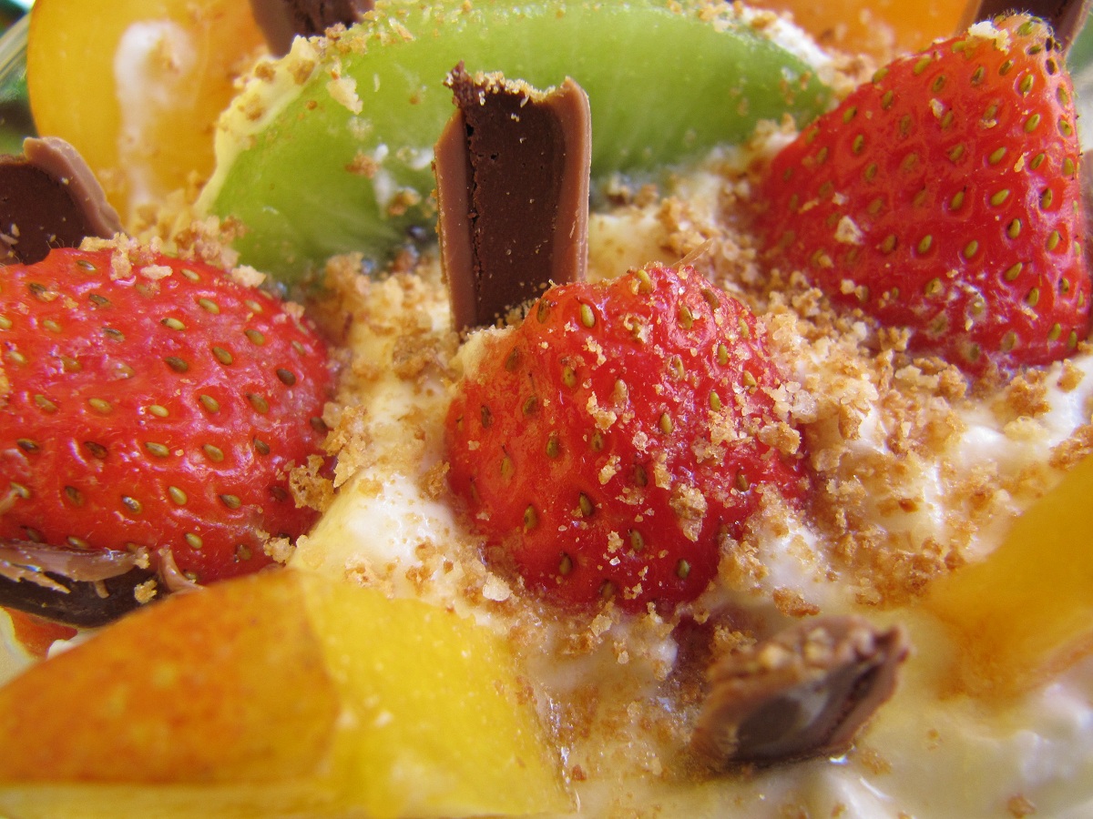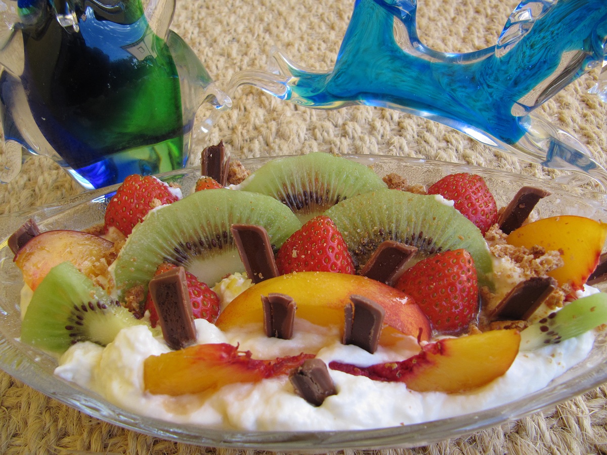 In una ciotola mescolate la ricotta con un po’ di sciroppo d’acero e la parte gialla della buccia di limone grattugiata, poi la mettete sul fondo di una coppetta o di una vaschetta. Spolverate con gli amaretti sbriciolati ed iniziate a disporre la frutta affettata.