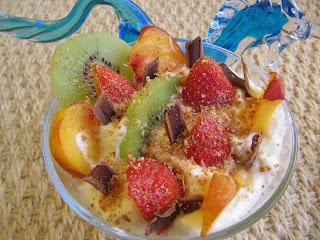 Unite un po’ di zucchero a velo alla panna e la montate ben soda, la distribuite sulla ricotta e aggiungete la frutta restante.