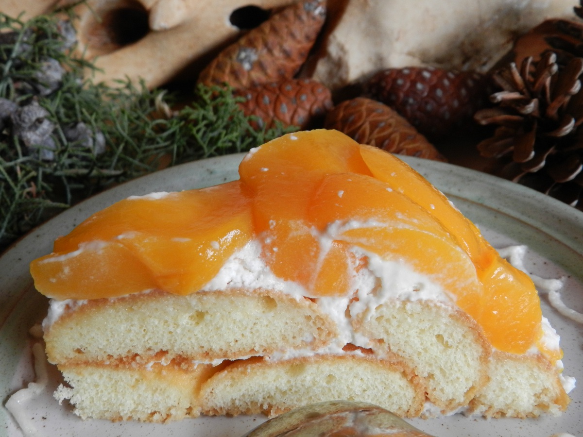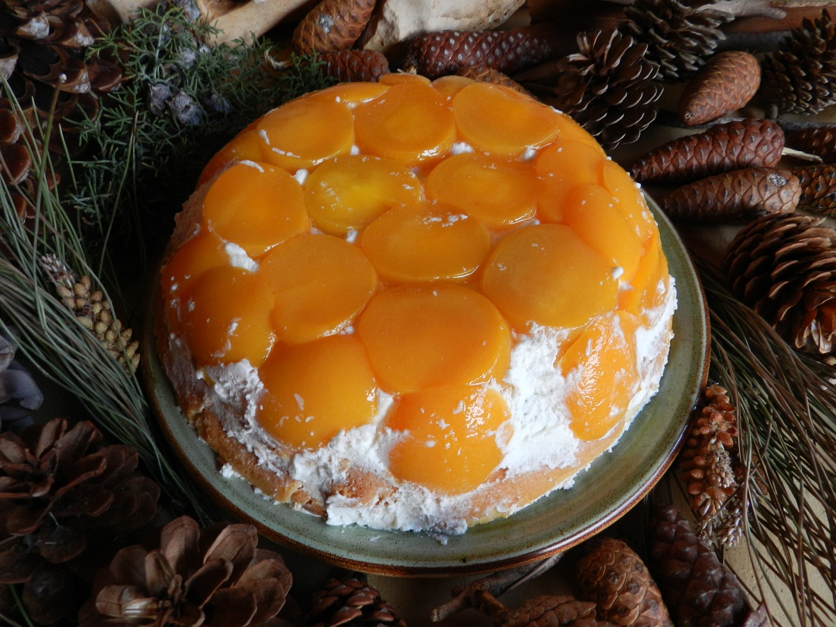 Foderate con le pesche il fondo di una terrina e spalmate sulla superficie qualche cucchiaiata di panna.