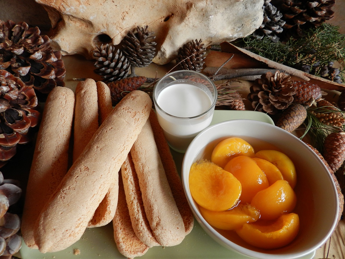 Tagliate a fette tonde le pesche sciroppate e montate la panna.