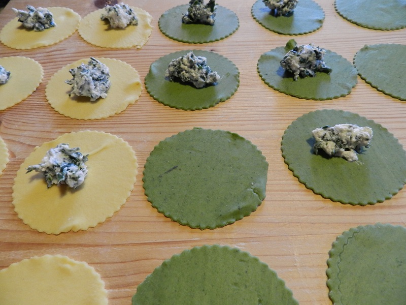 Passate la pasta nell’apposita macchina sino ad ottenere delle strisce alte circa 9-10 cm e non troppo sottili, disponeteci sopra mucchietti equidistanti di ripieno, ricoprite con la pasta e ritagliate con l’attrezzo adatto o con ciò che avete a disposizione (anche un bicchiere va bene).