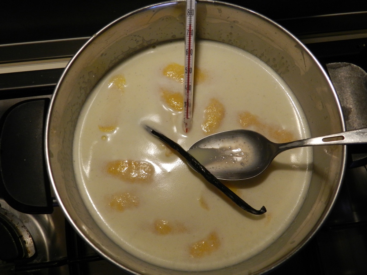 Versate il composto in un tegame, aggiungete la vaniglia e la buccia di limone e fate sobbollire sino ad una temperatura di 80°, oltre questa temperatura il tuorlo cambia sapore.