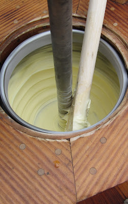 Si tiene girata di continuo la manovella della macchina e quando il composto inizia a rassodare vicino alle pareti del contenitore si tiene smosso con una paletta di legno sino a quando raggiunge la giusta consistenza, ossia verso i -12°.