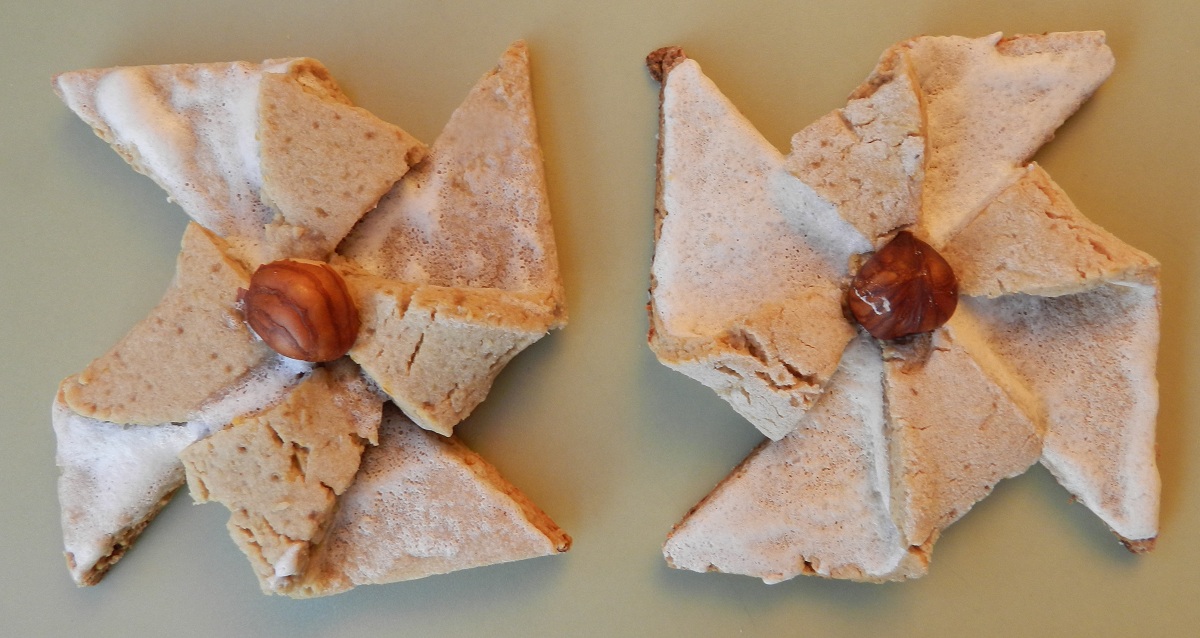 Stendete col mattarello la pasta sull’asse dello spessore di 4-5 mm, spennellate con un po’ di glassa densa (ottenuta frullando un po’ d’albume con zucchero a velo) Ritagliate dei quadrati di 6-7 cm di lato, poi tagliate le diagonali evitando il centro, infine ripiegate le punte e mettete la nocciola come mostrato sopra.