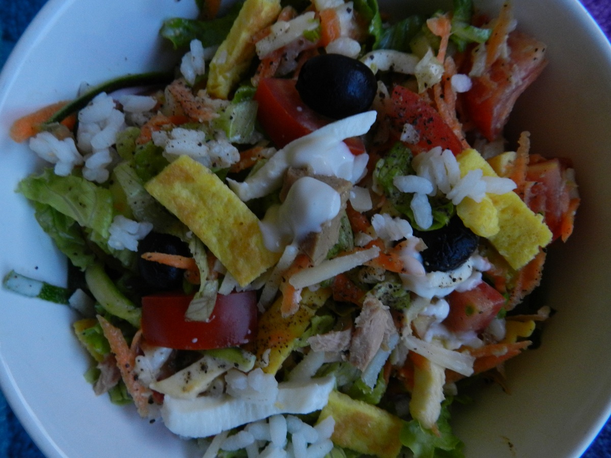 Fate cuocere il riso al dente. Con uovo, grana grattugiato e sale fate una piccola frittata, poi tagliatela a listarelle. Grattugiate le carote e la buccia della zucchina con l’apposito attrezzo. Affettate il cetriolo e tagliate a pezzetti  il pomodoro, l’insalata e la Feta. Sminuzzate il tonno.