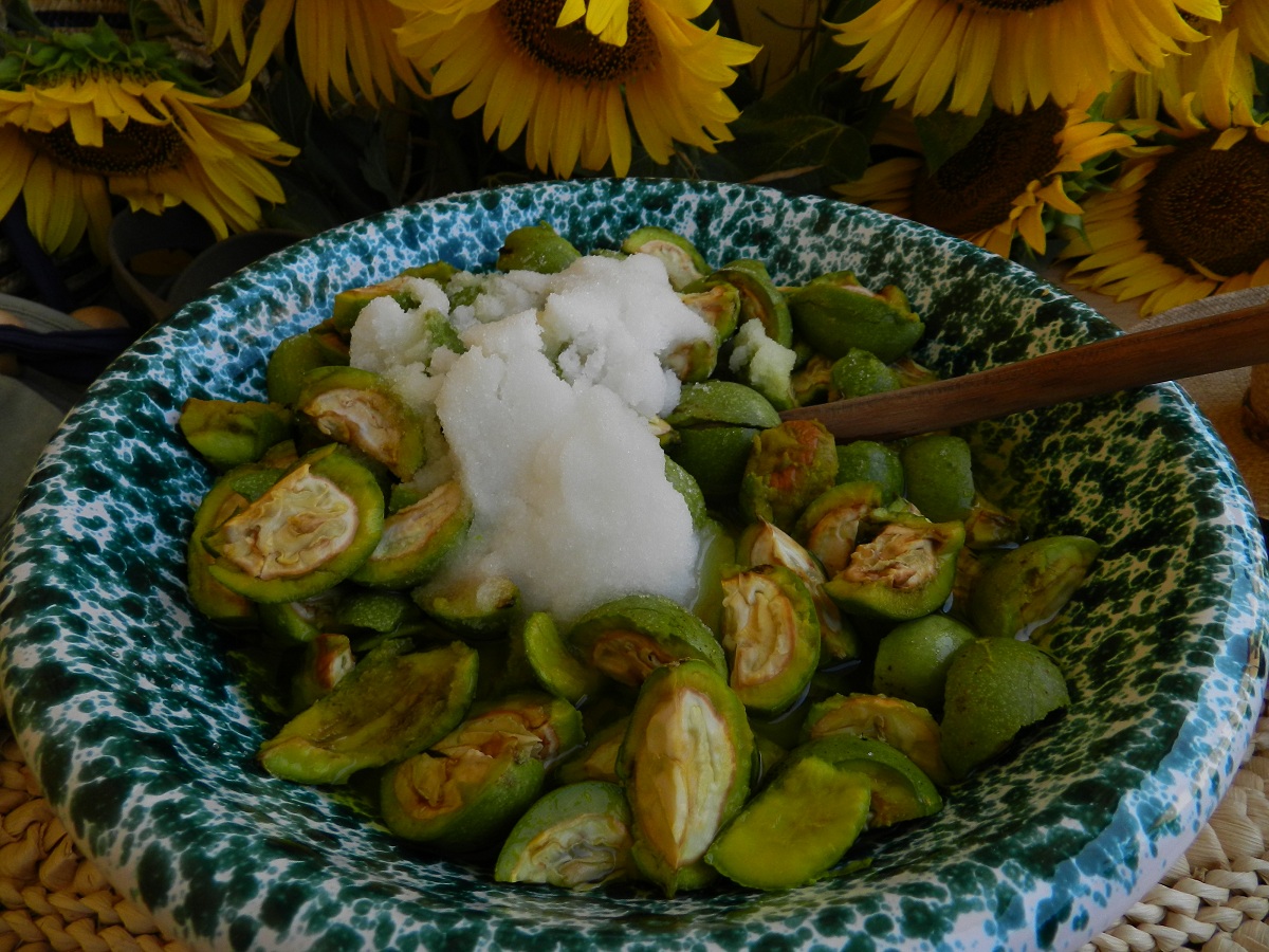 Mettetele in una ciotola, aggiungete 1300 gr di zucchero ed il liquore.