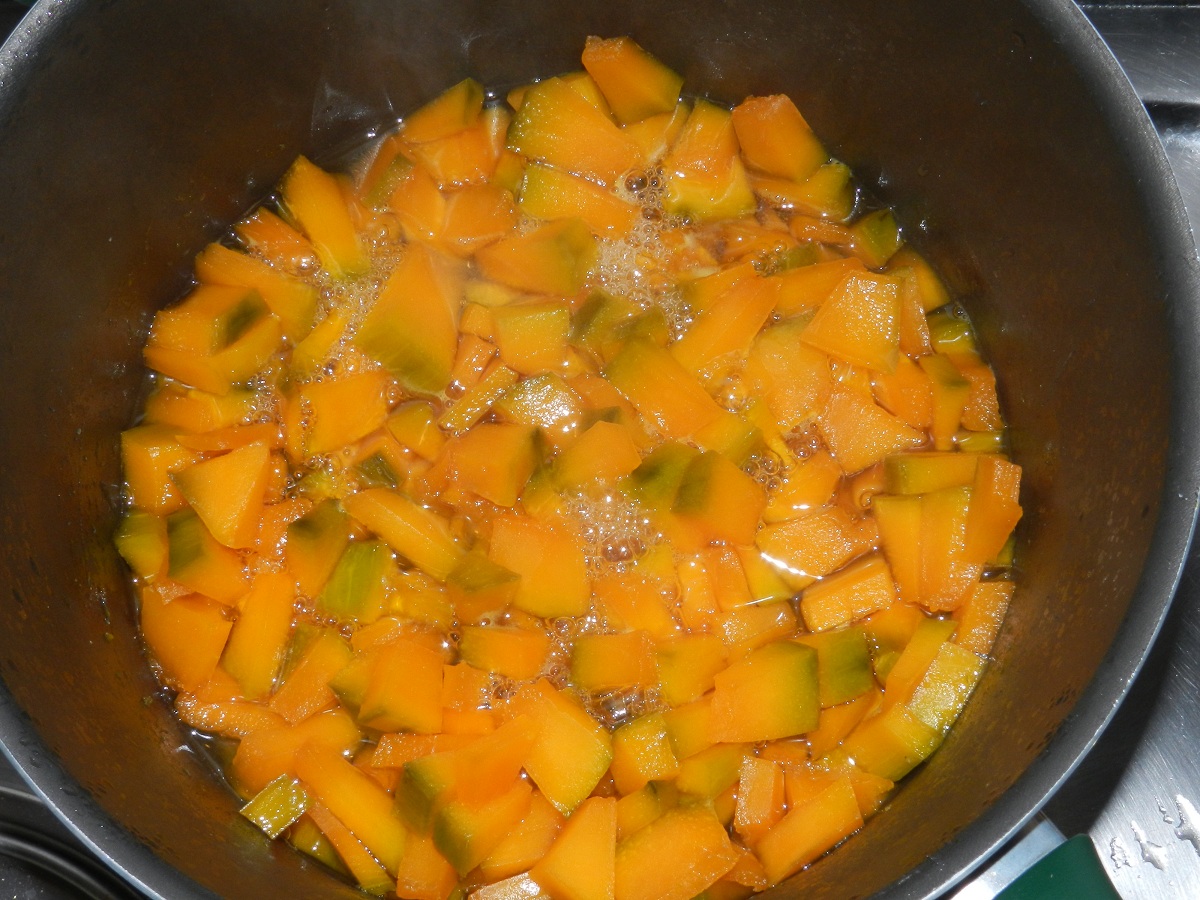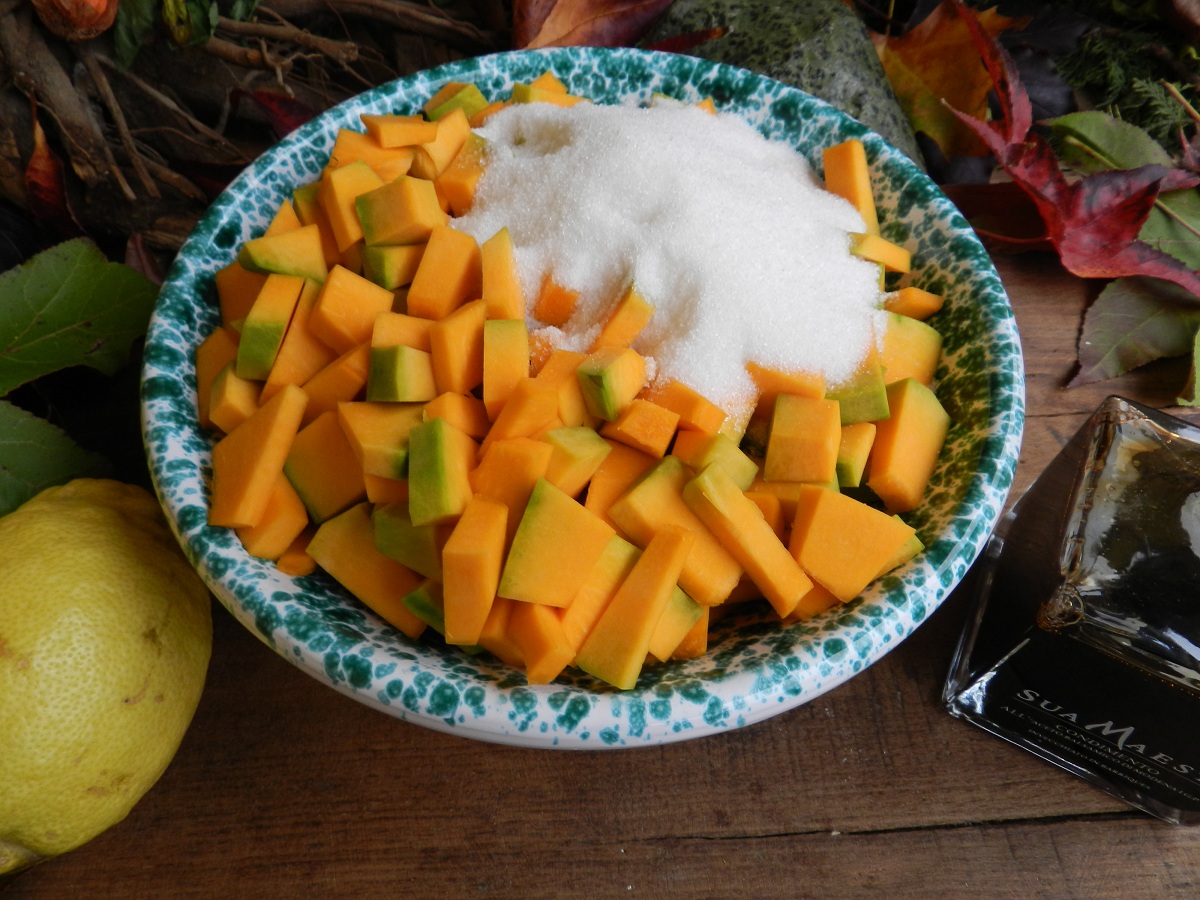 Tagliate la zucca a piccoli pezzi, mettetela in una casseruola antiaderente con zucchero e succo di limone.  Fatela cuocere a fuoco moderato per 2 ore.