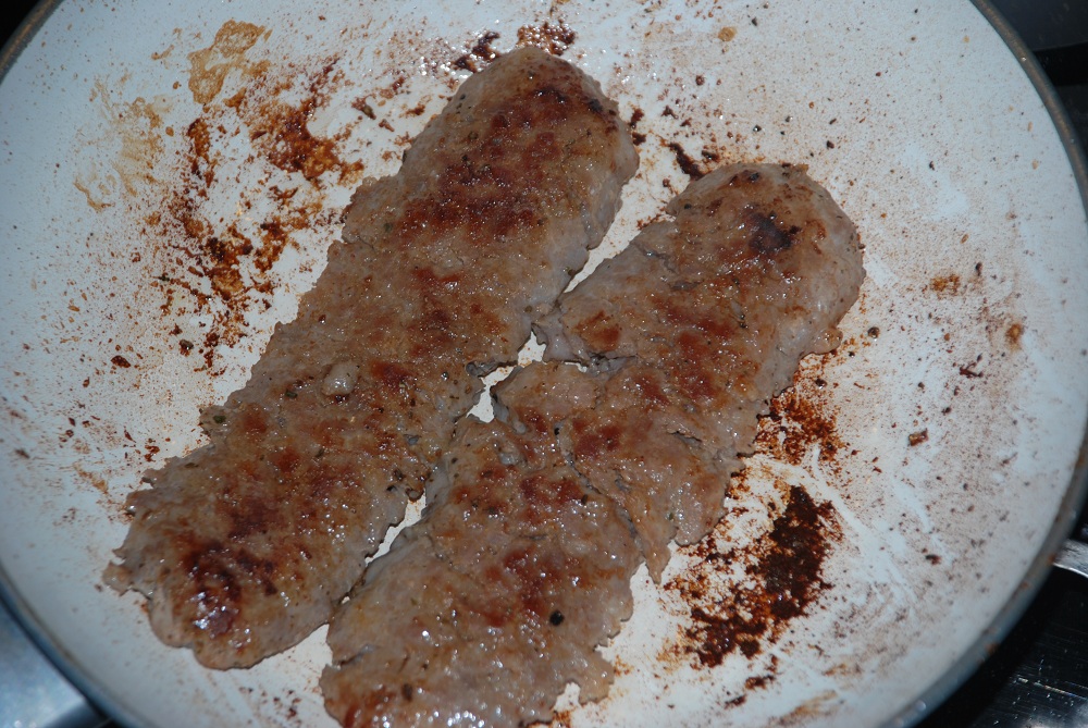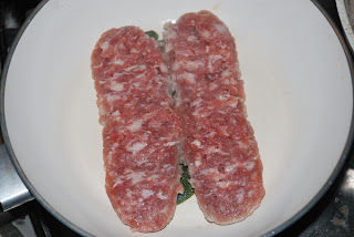 Tagliate la salsiccia a metà per il lungo e fatela sgrassare in un a padella sul fornello.