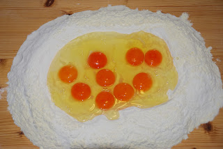 Disponete la semola a fontana sull’asse, mettete al centro le uova e incominciate a impastare aiutandovi con una forchetta,