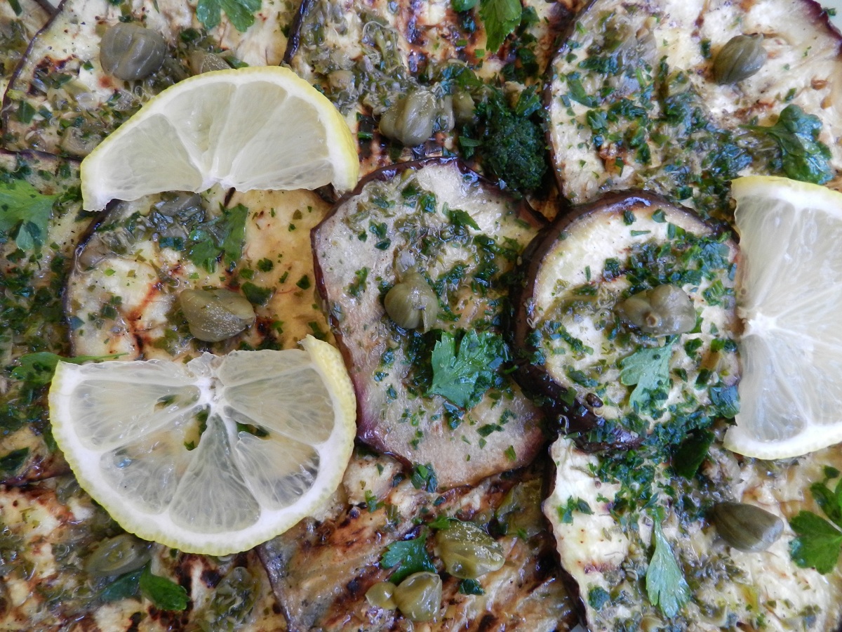 Tritate il prezzemolo, lo mettete in una ciotolina con il succo del limone, un po’ d’olio, un pizzico di sale e mescolate. Sistemate la melanzana in un piatto da portata, irrorate con il condimento preparato, distribuite capperi e qualche fogliolina di prezzemolo ed ornate il piatto con qualche fetta di limone. Servite in tavola.