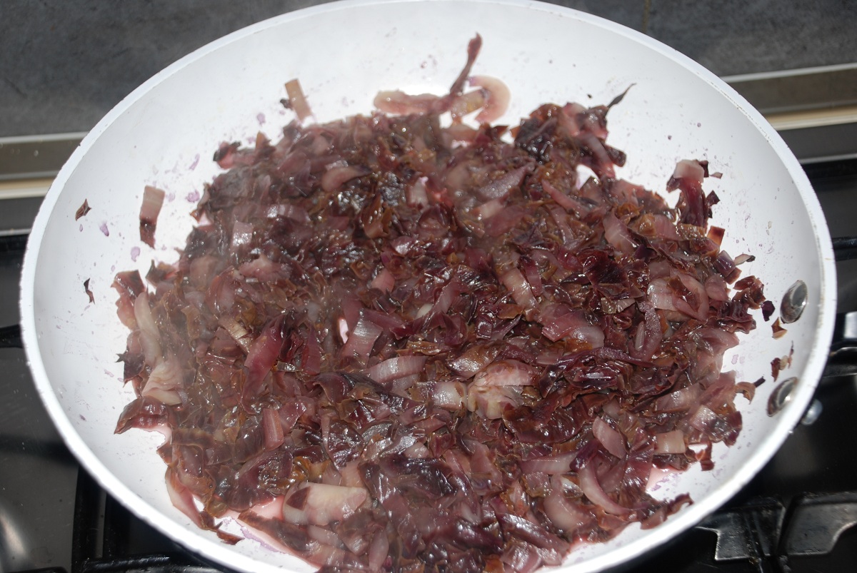 In una ciotola mettete la ricotta, il grana grattugiato, le spezie, il sale ed il radicchio lessato, mescolate sino a quando il ripieno è ben amalgamato.