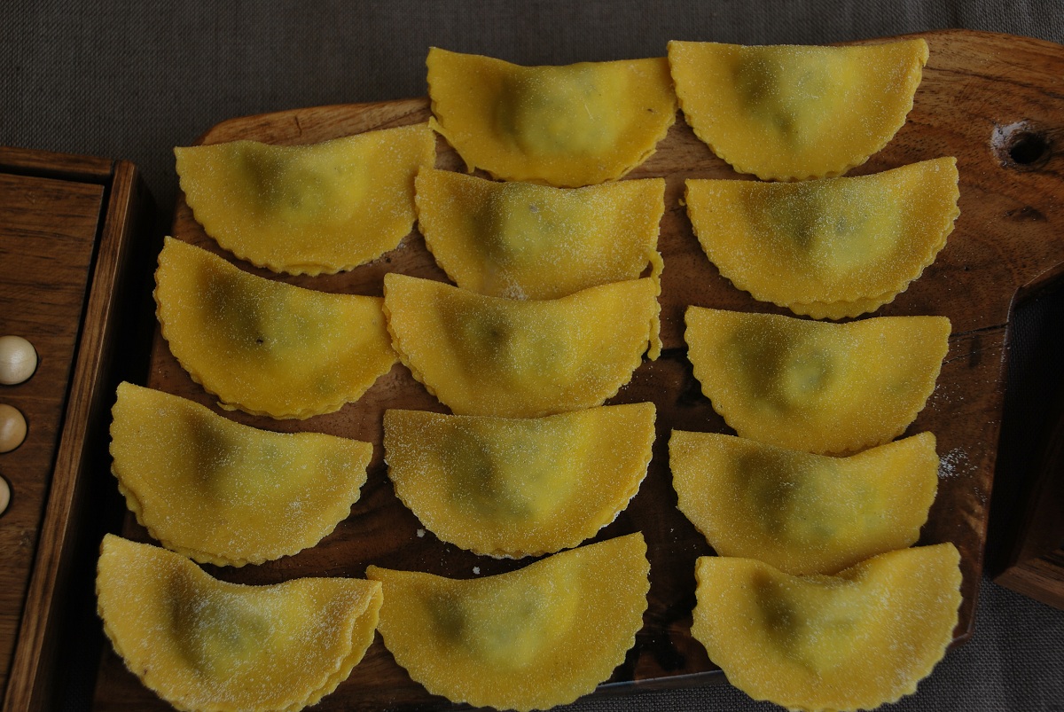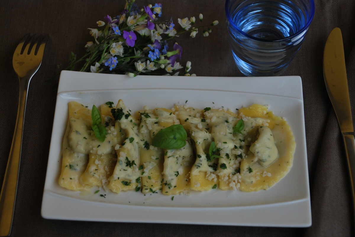 Scolate, mettete le mezzelune nel piatto e condite con la crema di ceci ed una spolverata di basilico ( o prezzemolo) e grana grattugiato, servite ben caldi.