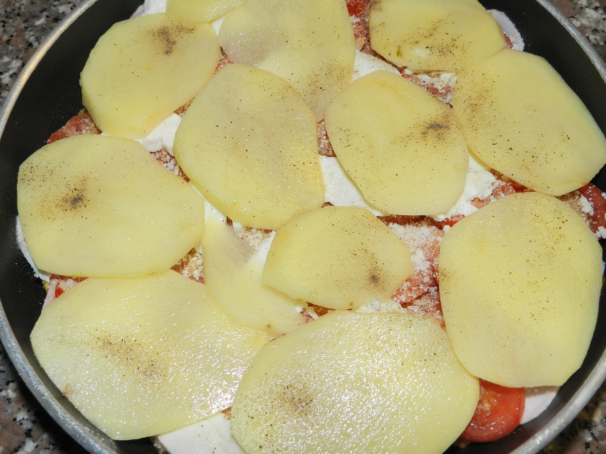 sbucciate zucca e patate, tagliate a fette sottili (5-6 mm), spolverate con sale e pepe.