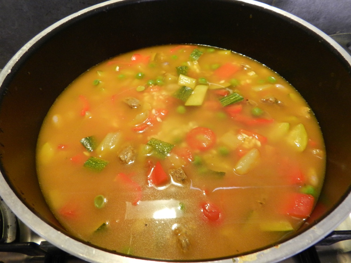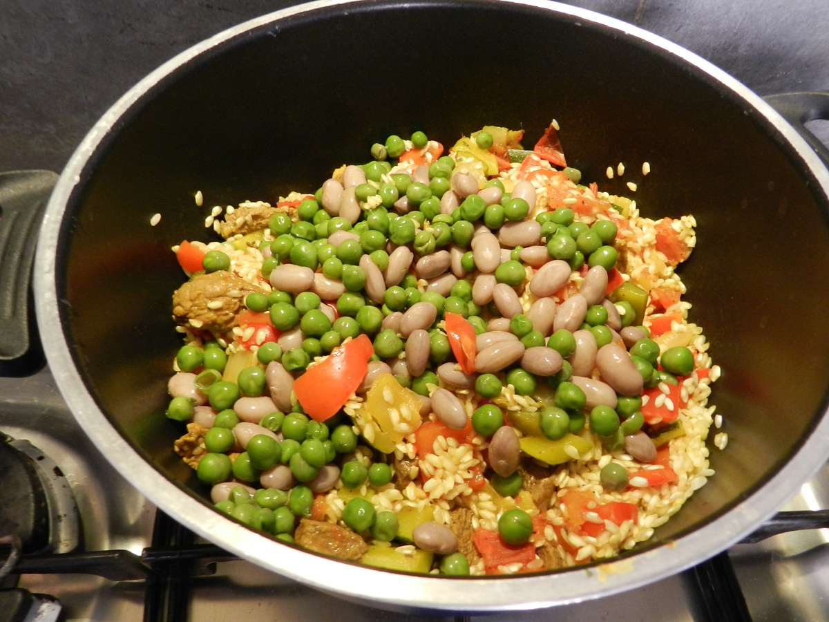 In un tegame dai bordi alti versate le verdure e lo spezzatino di vitello, aggiungete il riso e mescolate piano, per non spezzare le verdure.