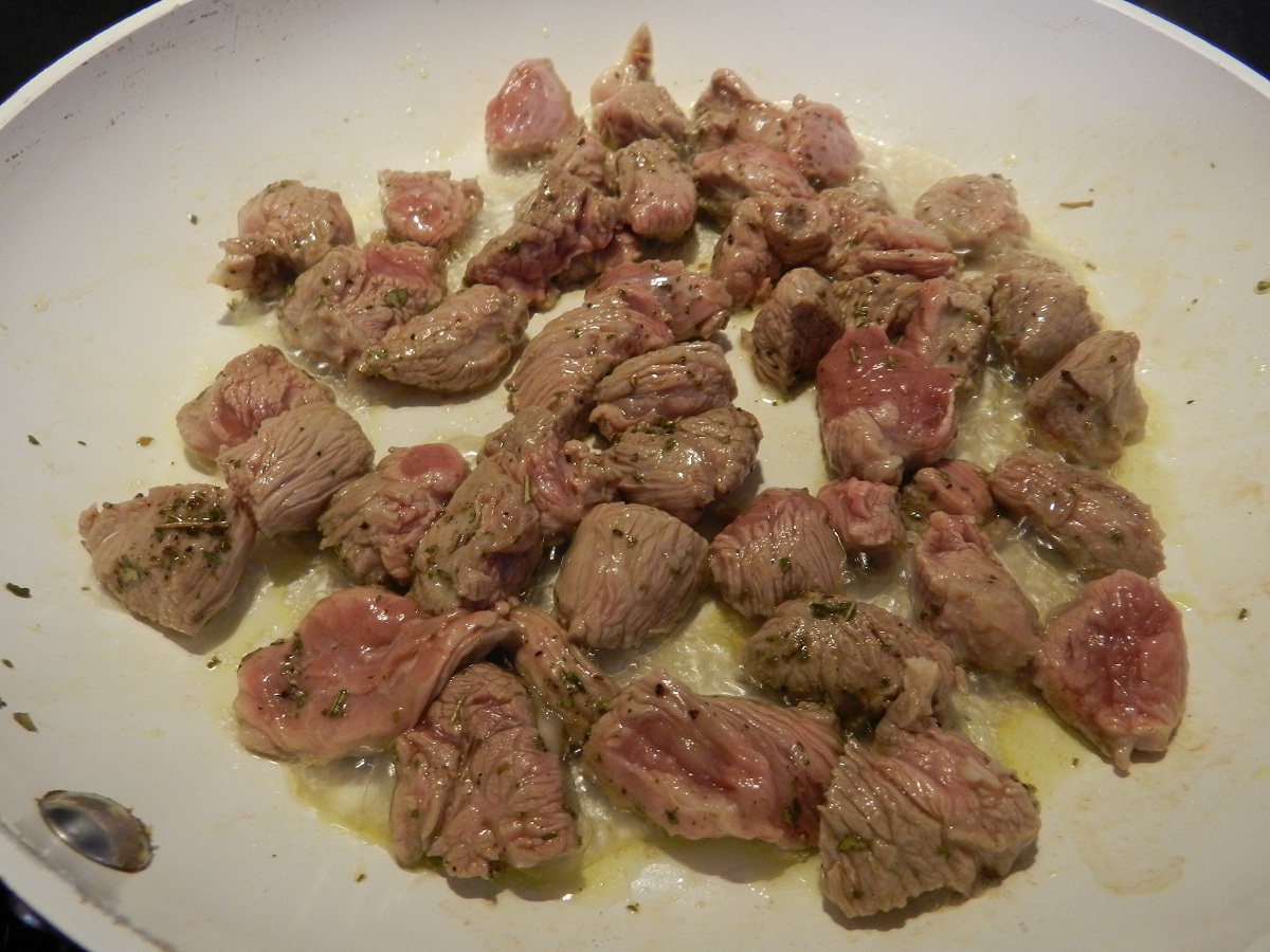 Fate rosolare la carne in una padella con olio, aromi e sale, aggiungete se necessario un po’ di brodo
