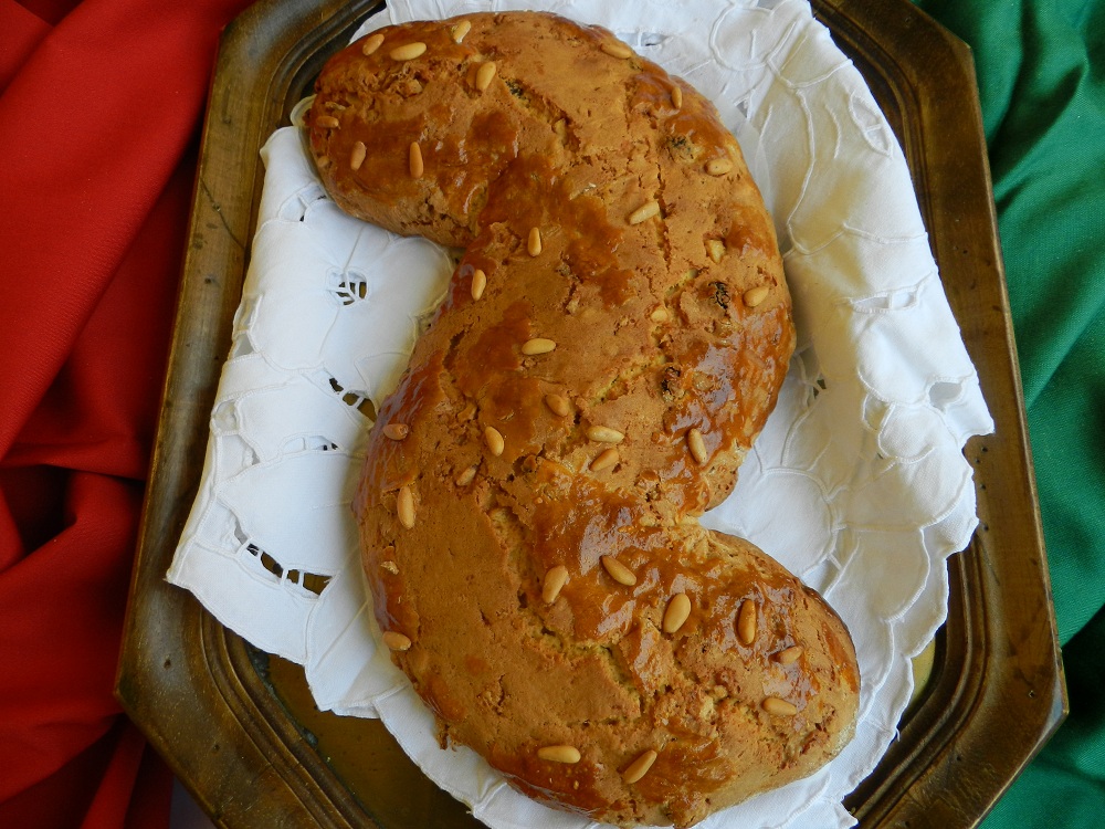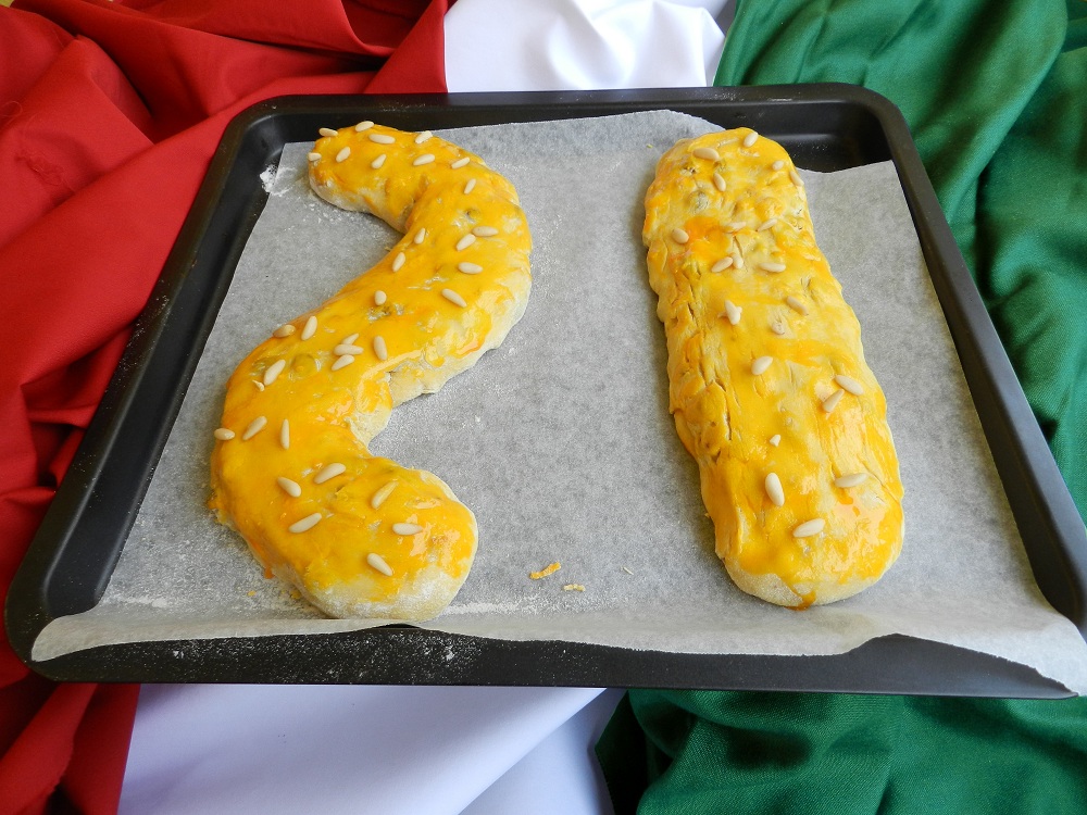 Rimaneggiate il composto e formate due pani a forma di spola, dorateli con un tuorlo.