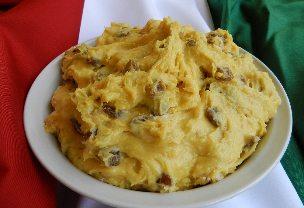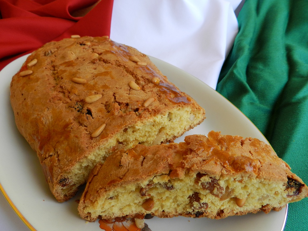 Mescolate lo zucchero con la farina uniteci il burro fatto a pezzetti le uova e il latte, sino a quando il composto sarà omogeneo poi aggiungete i pinoli, i canditi e l’uva.