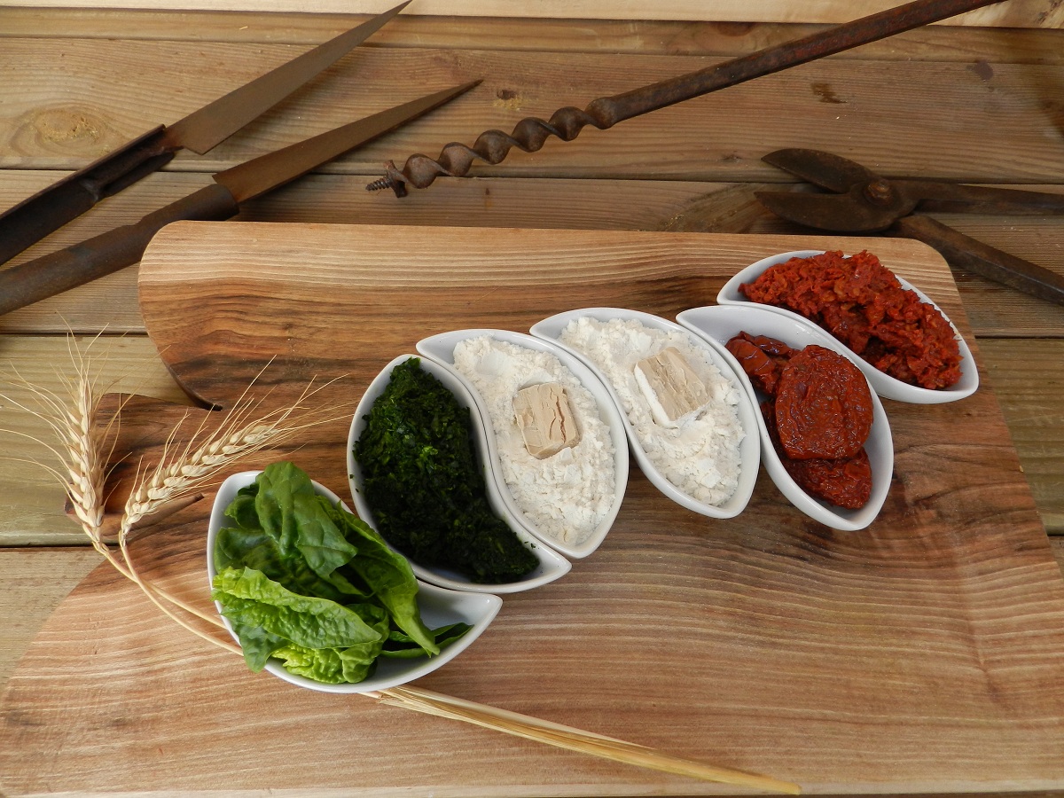 1) Preparate 3 impasti: ognuno con 7 gr di lievito di birra sciolto in 90 gr di acqua tiepida, 180 gr di farina, un pizzico di sale, un cucchiaino di olio e uno degli altri tre ingredienti. (le noci triturate per il pane bianco, gli spinaci per il pane verde e il concentrato di pomodori per il pane rosso.)
