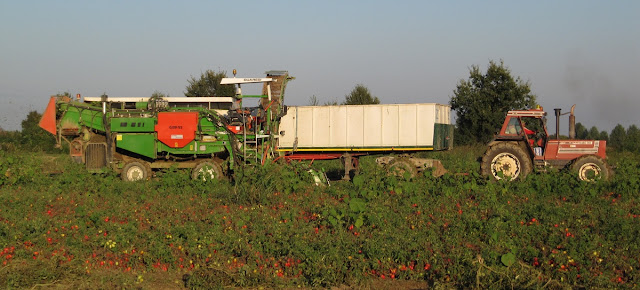Pomodori verdi scartati dai macchinari  e pomodori rossi in partenza per le industrie conserviere