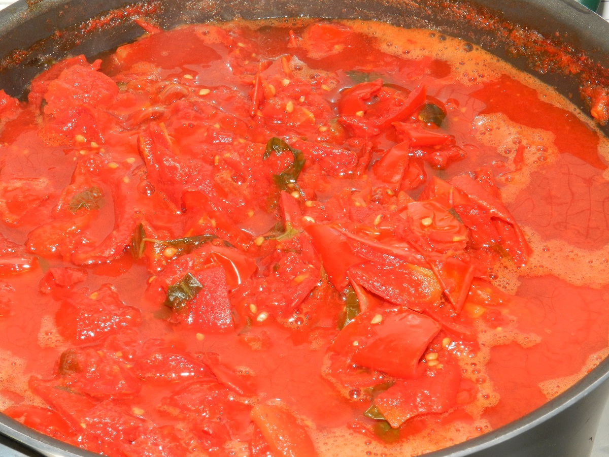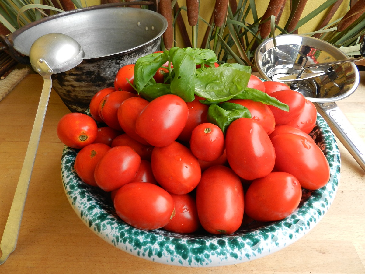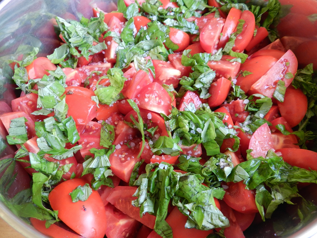 Lavate bene i pomodori, tagliateli a pezzi e metteteli in una grossa pentola assieme al basilico tritato grossolanamente  ed un po’ di sale