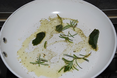 Mettete in una padella l’olio d’oliva con un po’ di salvia e rosmarino,