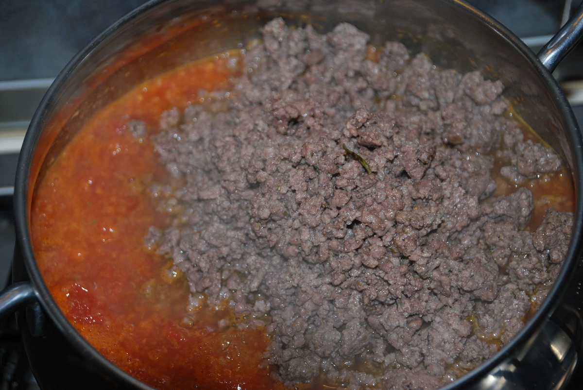 Aggiungete la carne macinata e continuate la cottura a fuoco lento per un paio d’ore, aggiungendo quando necessario un po’ di brodo.