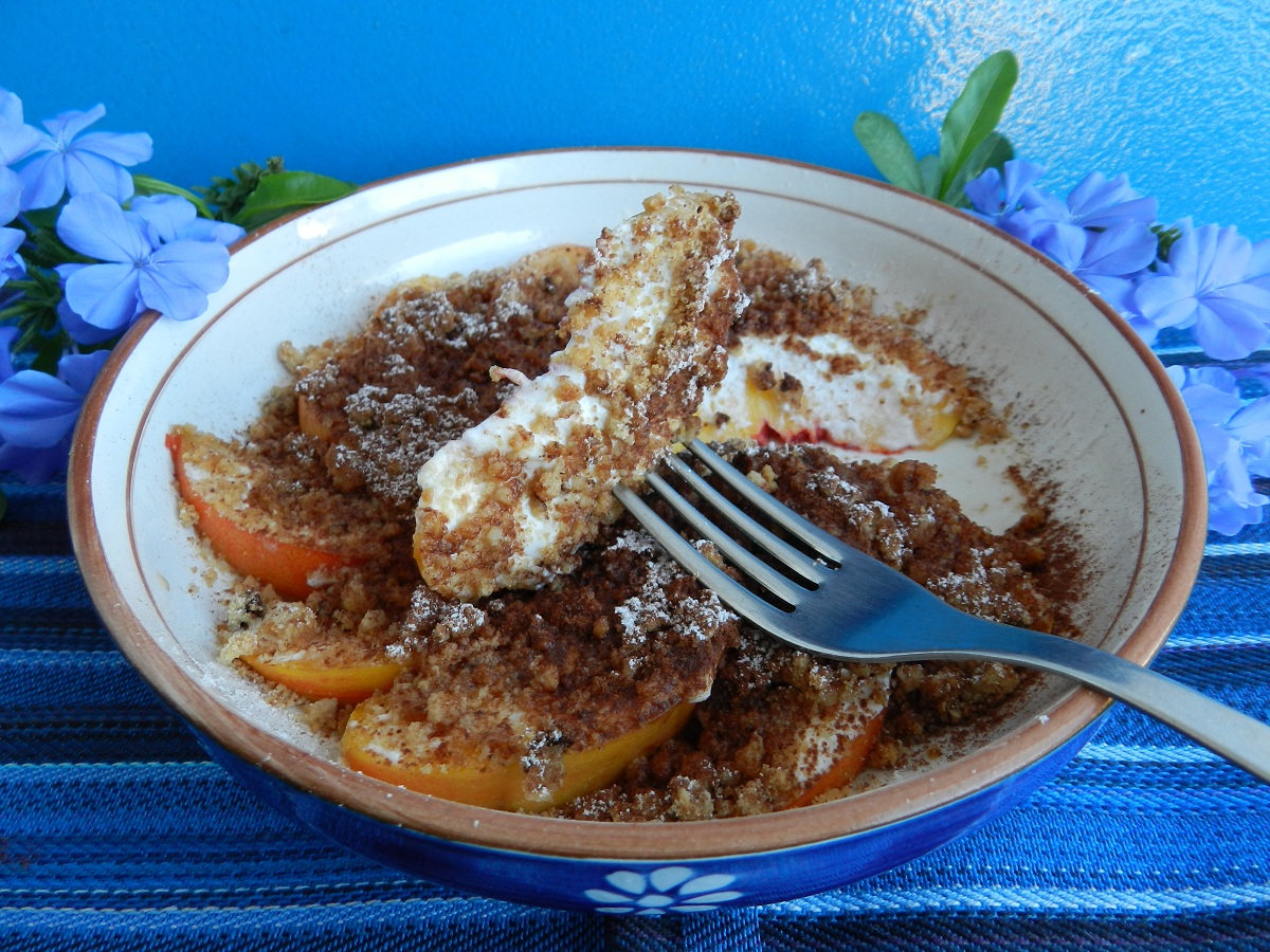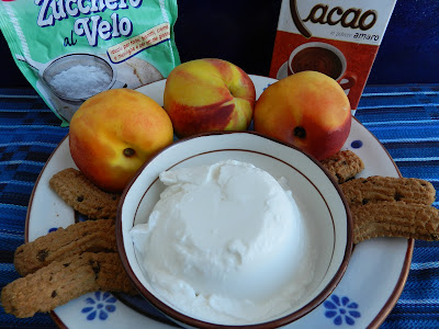 Tagliate le pesche a fette sottili, le disponete a raggiera in un piatto piano. In una scodella mescolate ricotta, succo di limone, metà zucchero a velo e poi lo spalmate sulle pesche. Spolverate con i biscotti sbriciolati, il cacao amaro ed il restante zucchero a velo.