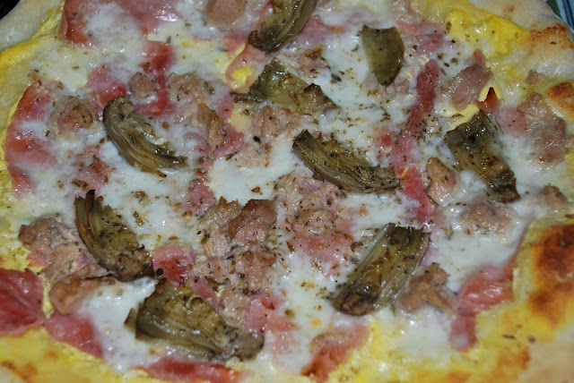 Fatta cuocere nel fornetto la pasta rimane più sottile e croccante, mentre cotta nel forno della cucina la pasta è più lievitata e morbida. Gustosa e abbastanza veloce da preparare. La base spalmata con tuorlo e ricotta, al posto della solita passata di pomodoro, è una valida alternativa che noi preferiamo.