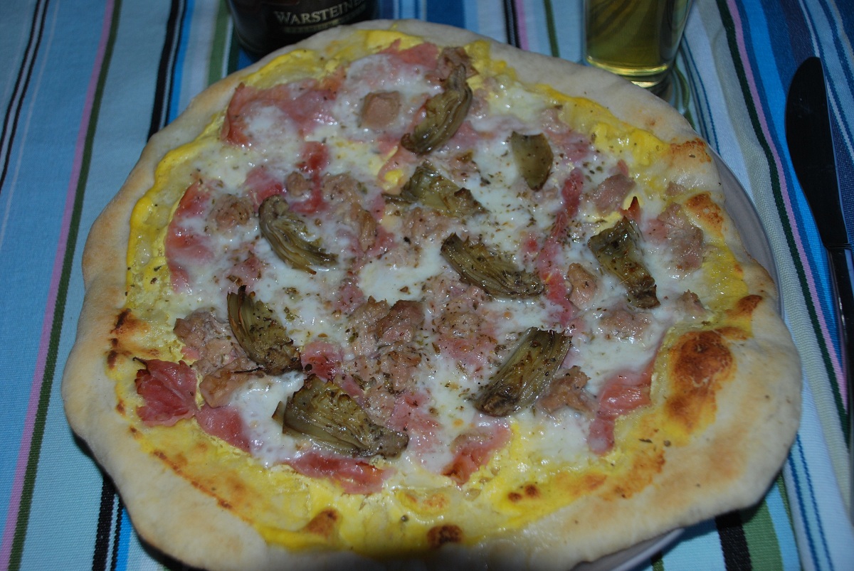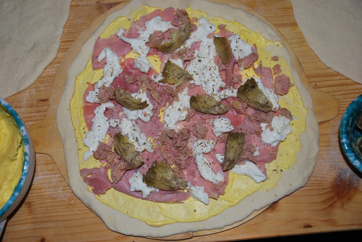 Fatta cuocere nel fornetto la pasta rimane più sottile e croccante, mentre cotta nel forno della cucina la pasta è più lievitata e morbida. Gustosa e abbastanza veloce da preparare. La base spalmata con tuorlo e ricotta, al posto della solita passata di pomodoro, è una valida alternativa che noi preferiamo.