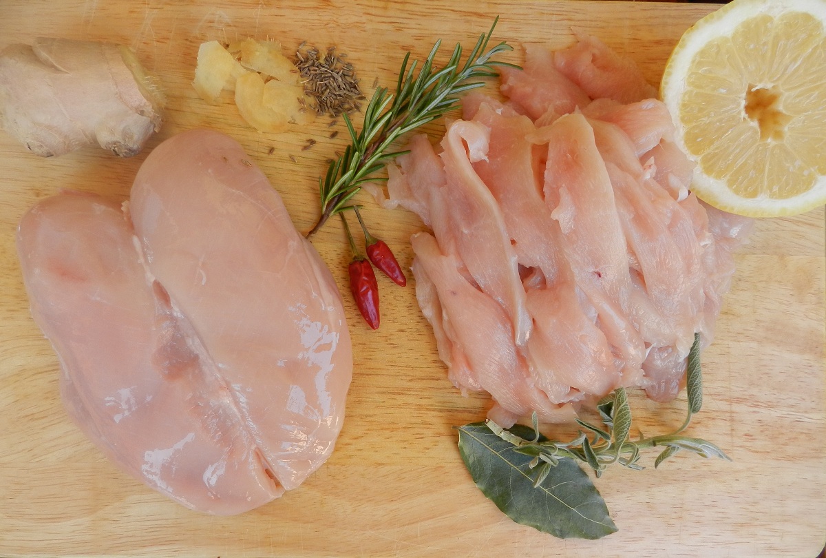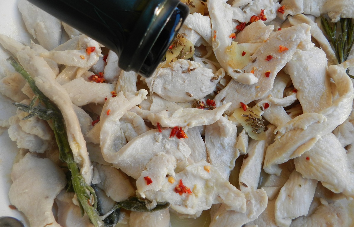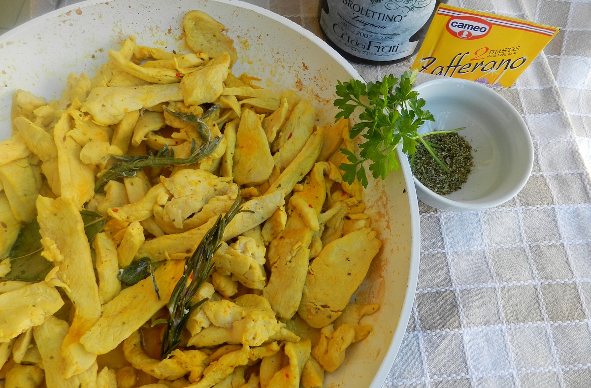 Togliete il grasso dai petti di polo e tagliateli a striscioline sottili. Mettete l’olio in una padella insieme a tutti gli aromi (tranne il prezzemolo) e fate rosolare il pollo per 5-6 minuti a fuoco vivace, mescolando ogni tanto.