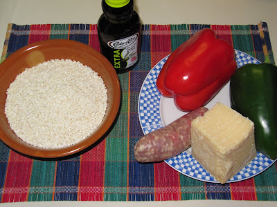 Pulite i peperoni e tagliateli a listarelle, togliete la pellicina dalla salsiccia e tagliate delle fettine dello spessore di 7/8 mm